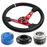NRG-SRK-180H+200SL+101BL+006RDY, NRG Innovations 13.78" 350mm 3" Deep Dish Style Black Leather Yellow Center Marking Red Spokes Racing Steering Wheel Combo with 6 Hole Short Hub Adapter with Gen 2.0 Silver Quick Release with Blue Lock Hub Kit SRK-180H